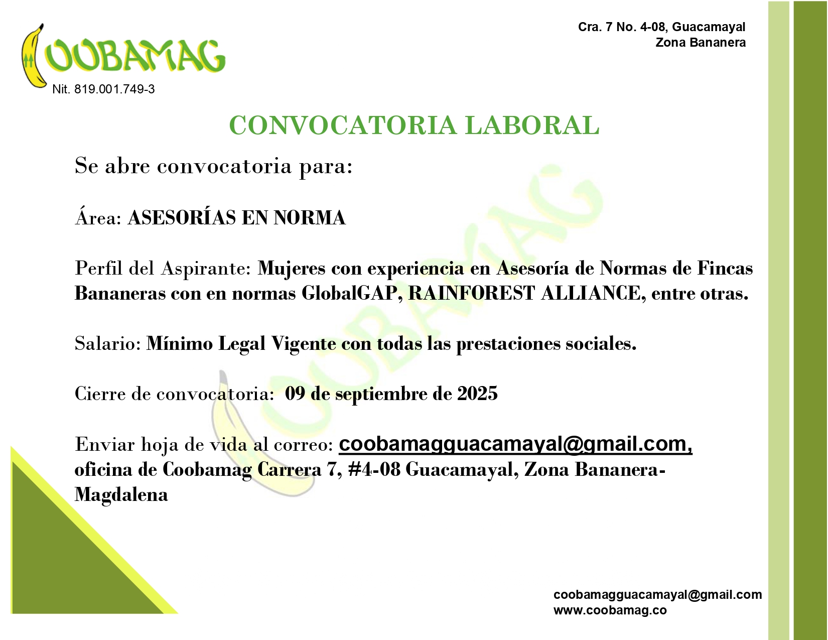 La cooperativa Multiactiva de Bananeros del Magdalena “COOBAMAG”, es un conjunto de pequeños productores dedicados a la producción, cosecha y empaque de banano con destino a mercados Nacionales e Internacionales, que es comercializado a través de C.I. BANASAN S.A.S, por lo cual adaptamos su política a nuestro proceso administrativo. Consientes de la importancia y necesidades de realizar un buen manejo de recurso humano y natural como parte integral de nuestro quehacer, los productores se comprometen a orientar la actividad hacia la prevención y disminución de los impactos ambientales y los riesgos de la seguridad y la salud ocupacional, y a procurar el bienestar laboral, brindar un trato justo a nuestros trabajadores, prevenir la contaminación y garantizar la calidad e inocuidad de nuestros productos, bajo los siguientes lineamientos: